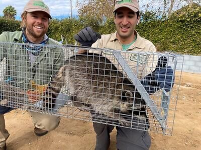 Ultimately, you should always try to have a cage on the same level as the raccoon, as the snare pole is not appropriate for lifting the raccoon as you are moving it. Try to guide the raccoon over into the cage, rather than forcing it as you are moving it. You may need a friend or colleague to hand as you move the animal into the cage itself, so that they can close the door as you remove the snare pole from the animal.